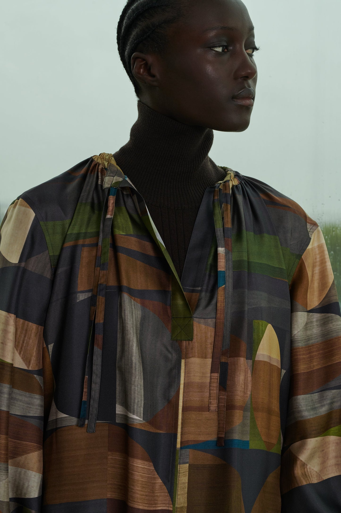 - Gathered round neckline, adjustable with two ties