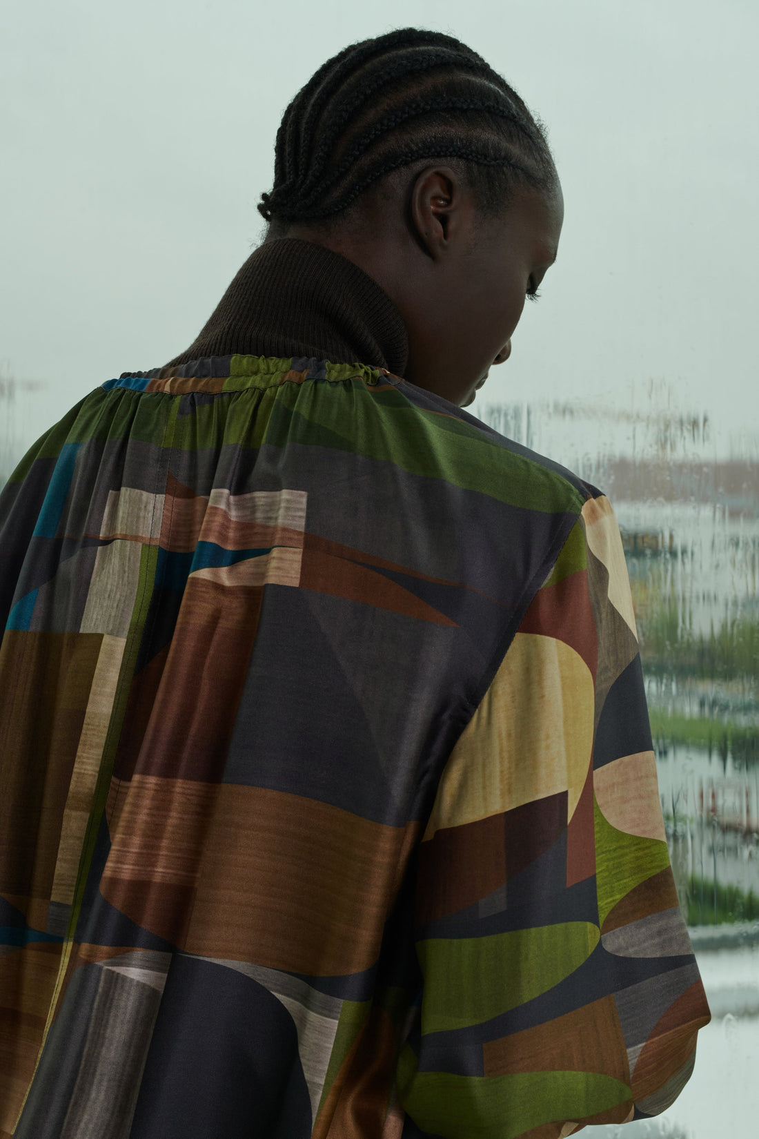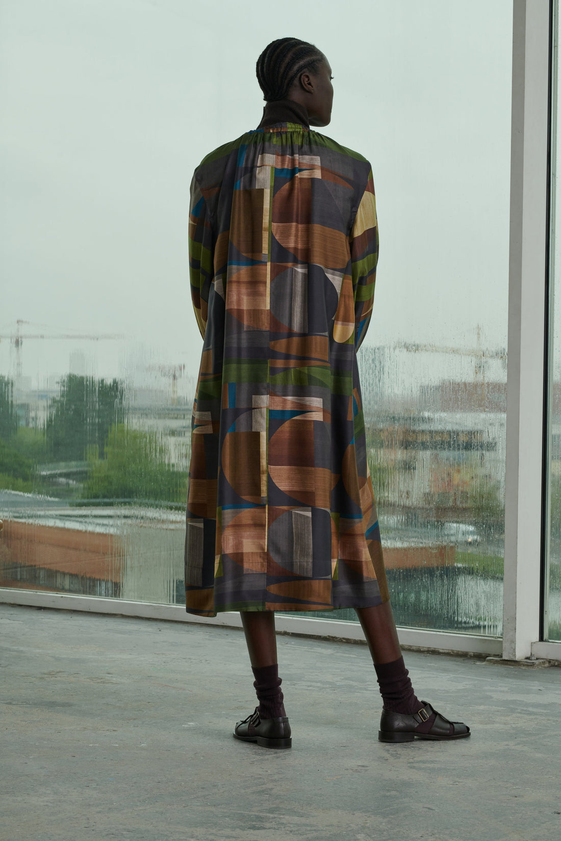 Printed silk twill floaty dress green/brown