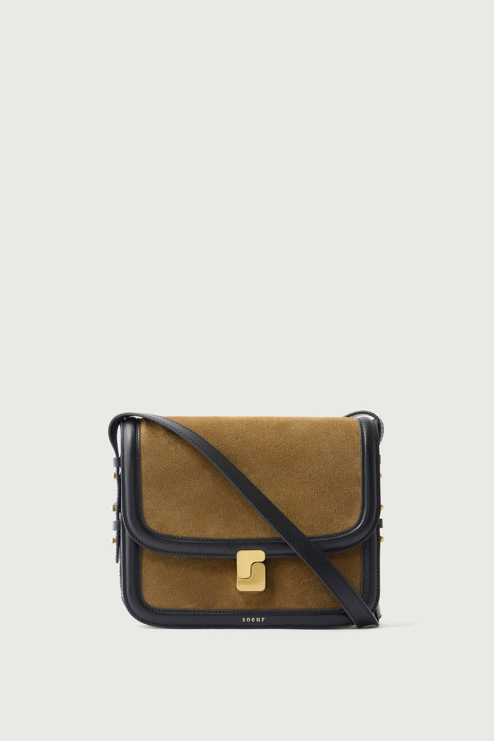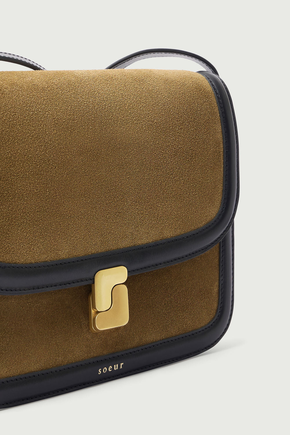 - Large front flap with a gold monogram clasp